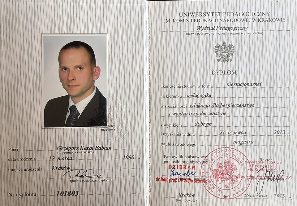 Dzięki ukończonym studiom pedagogicznym II stopnia na UKEN w Krakowie, jako nauczyciel z wykształcenia, łączy nowoczesne metody treningowe z wiedzą pedagogiczną.